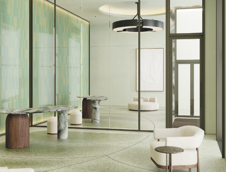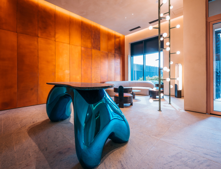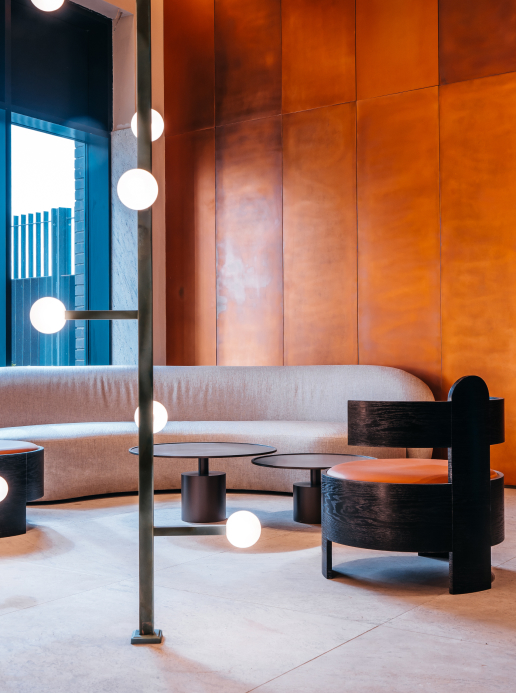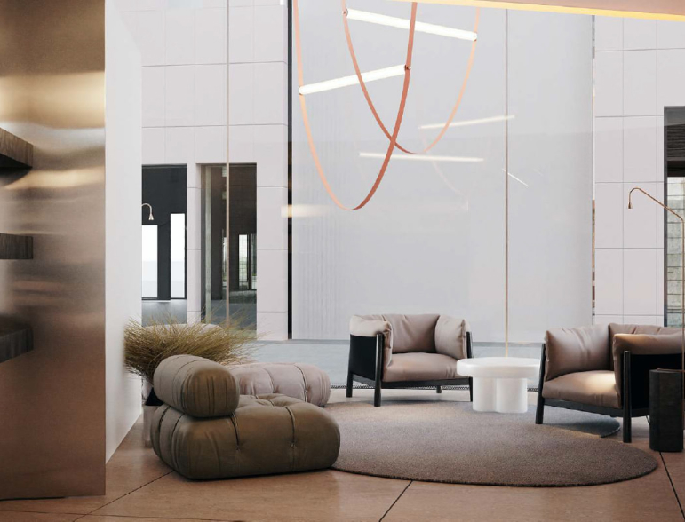 Мы высоко оценили природную составляющую проекта, такую редкую роскошь в большом городе, и сразу поняли, что природа должна проникнуть в помещение и стать главной темой в концепции лобби. Цветовая палитра навеяна теплым осенним настроением, мы выбрали нейтральную цветовую гамму и добавили в нее теплые медные оттенки и акценты из свежести зелени.