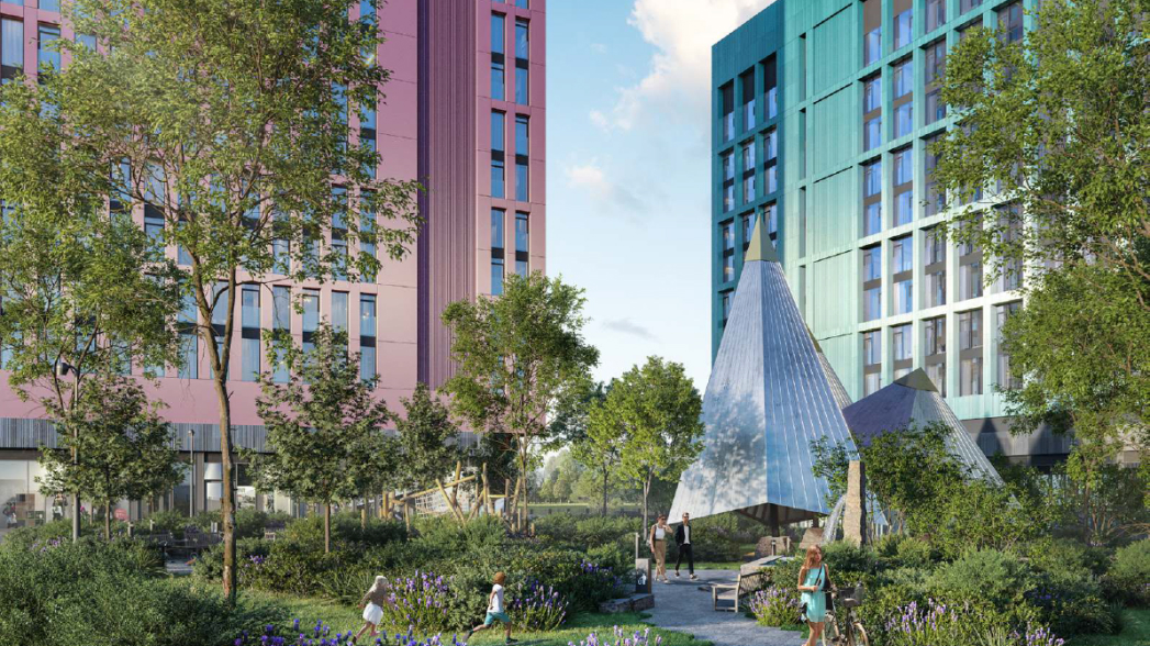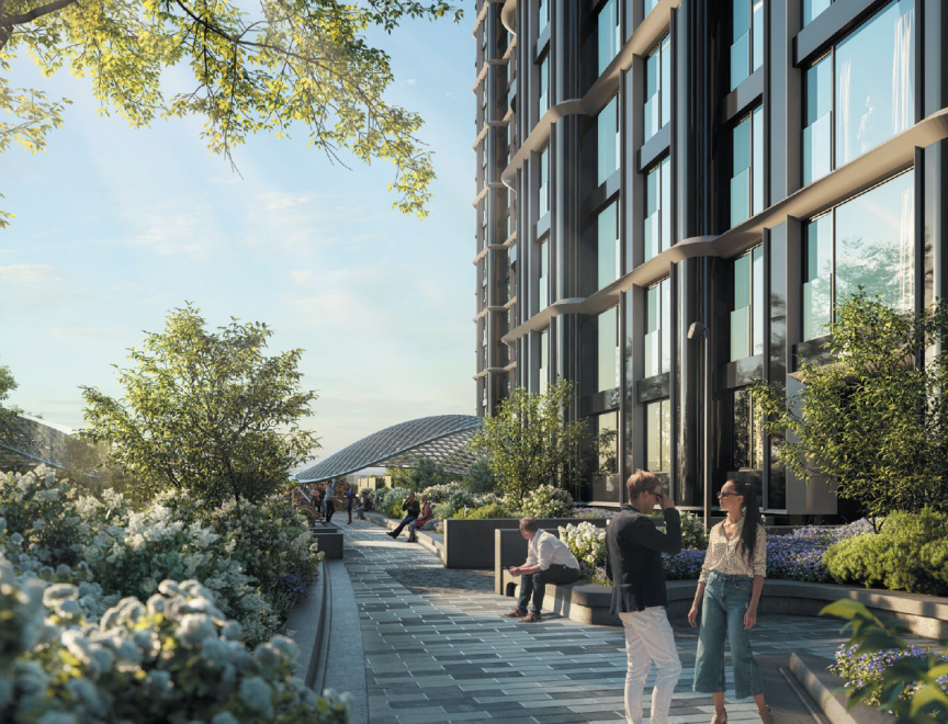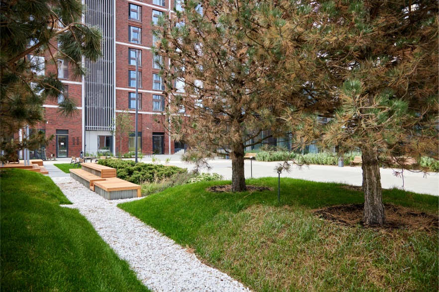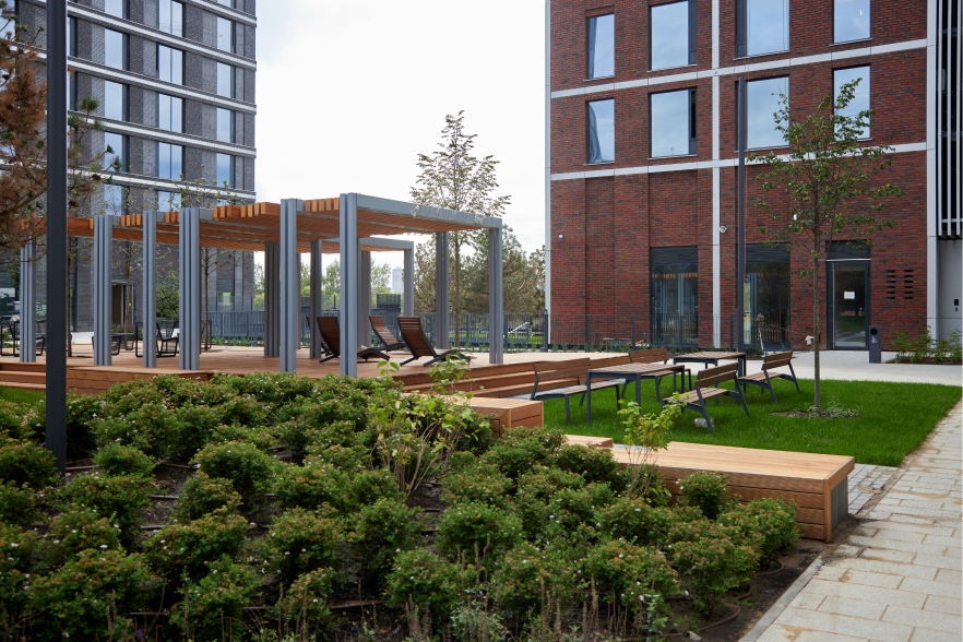 Мы окружили башни квартала мягкими, деликатными пейзажами. Этот городской лес естественным образом вливается в природное окружение комплекса. Яркими символами дворов станут три перголы с футуристичными куполами, спроектированные специально для этого московского проекта.