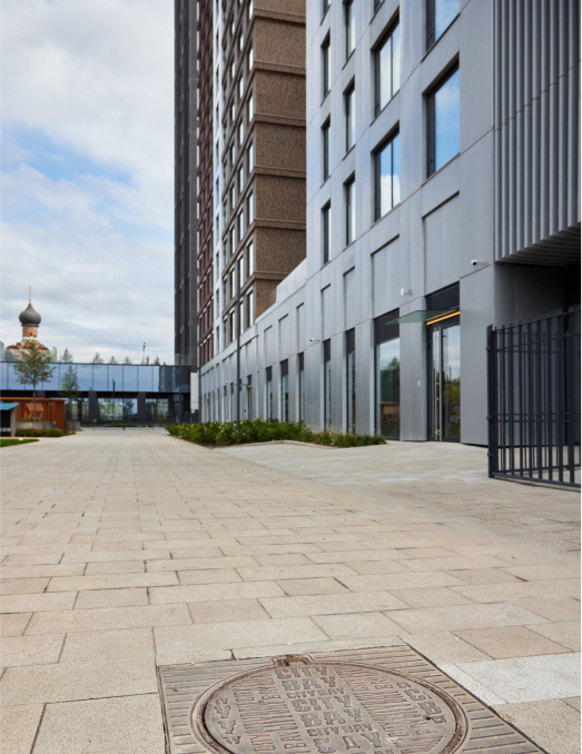 Клинкерная плитка естественных оттенков на среднеэтажных корпусах придаёт уют и традиционность. Сочетание металла и стекла раскрывает амбициозность небоскрёбов. Только качественные материалы фасадов — алюминиевый лист с анодированным покрытием и немецкая клинкерная плитка благородных цветов — создают облик нового современного города в городе со всеми его преимуществами.